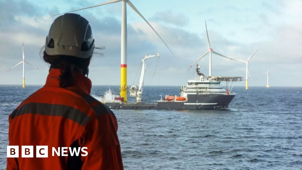 Getty Images A person wearing orange overalls and a hard hat looks out over the North Sea. There is a ship next to a large wind pylon in the centre of the shot, with other pylons in the background. Getty Images